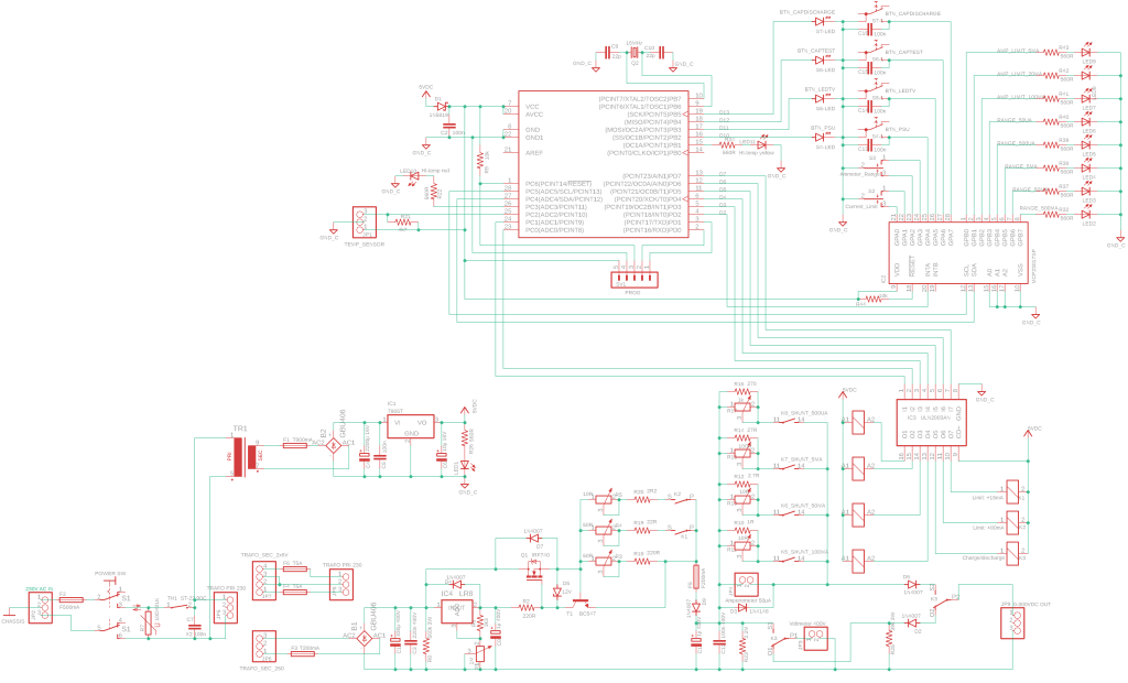 LED indicators show all the different combinations of modes, current limits, ammeter current ranges, and temperature status. Without enough IO ports on the ATMEGA, I used an MCP23017 IO extender, which has 16 IO ports, programmable via I2C. A ULN2003 with 7 darlington pairs is used to drive the relays.
