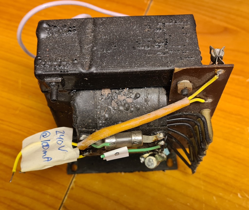 From a trashed Huldra 7 radio that was beyond repair, i scavenged the mains transformer (among other things). With no load, the transformer delivered 260Vrms and it’s T250mA fuse on the secondary side gave an impression of what it could deliver (though I wouldn’t deliberately push it to that limit).