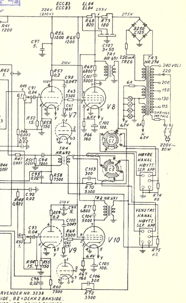 At first sight, the schematic may appear a little confusing, since there is an extra audio transformer + circuitry that makes the radio operable as an intercom when connected to a separate loudspeaker (typically placed in an other room of the house). There is also a tone control in there, with selectable RC-filters that affects the bass, midrange and treble, and different combinations of these filters are selectable through a rotary switch.