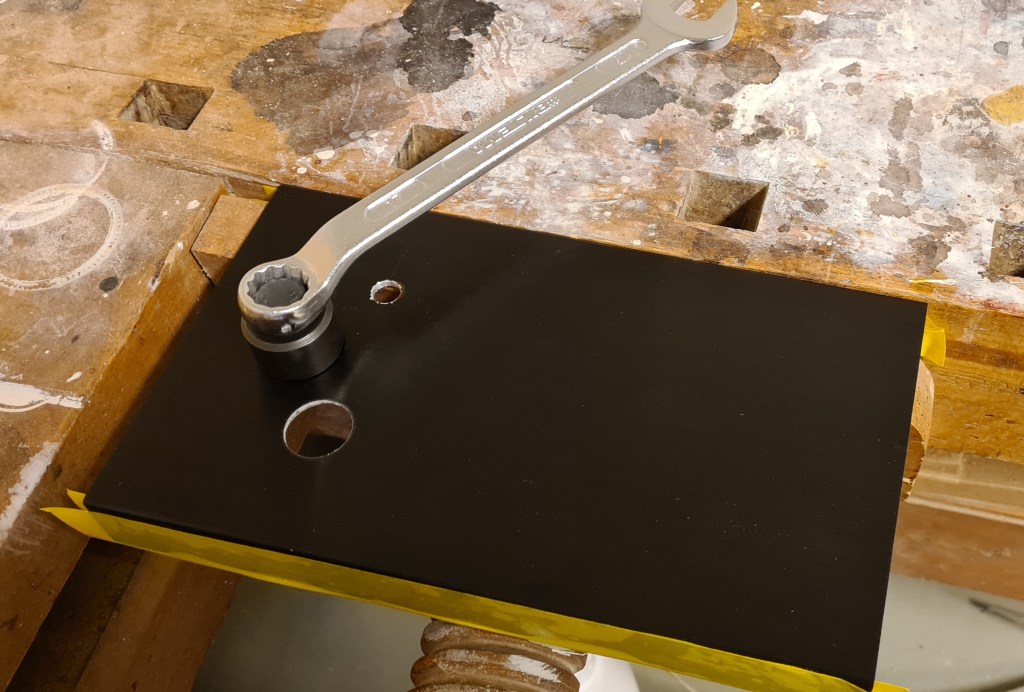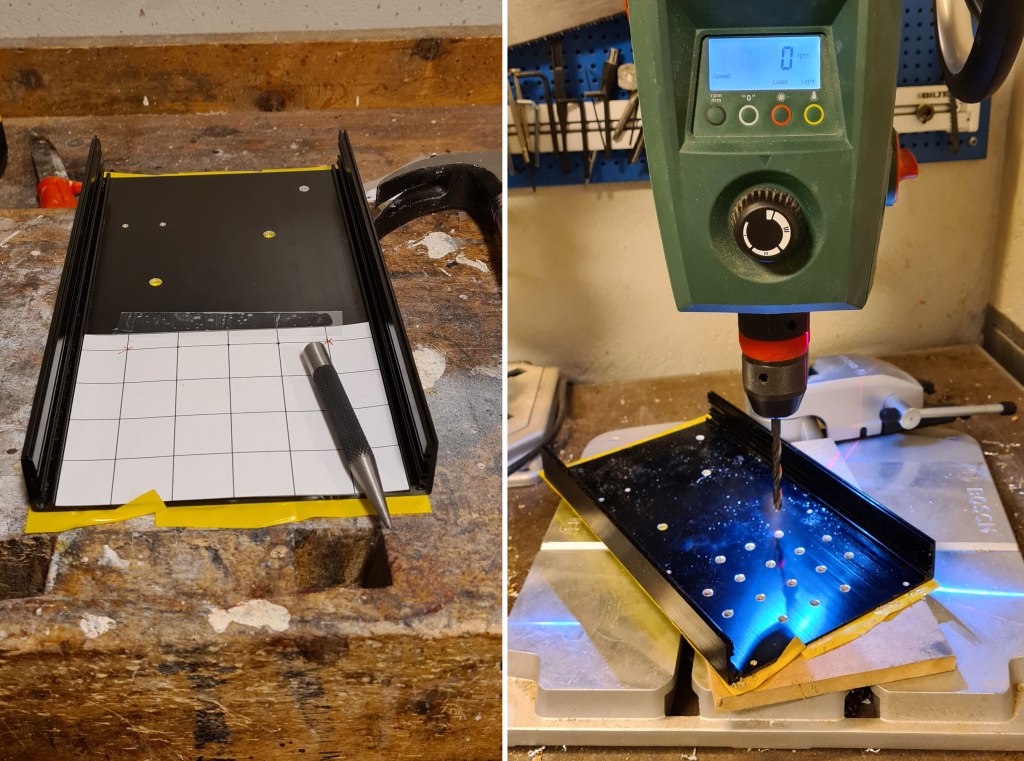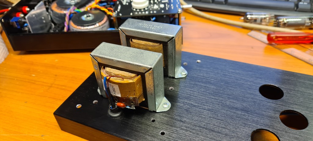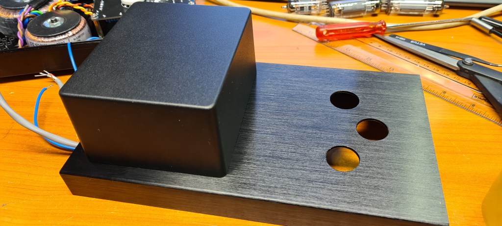 Drilling ventilation- and mounting holes on the chassis bottom part.Using a hole punch to create holes for tube sockets, in the chassis top part.Mounting output transformers to chassis.The OT’s are enclosed in an aluminium project box.Mounting of mains transformers, PCB and connectors. On the rear panel (to the left on the picture), there are audio input (3.5mm jack), speaker outputs (4mm banana jacks), mains inlet and bass boost switch. AC inlet and power switch were supplied with the chassis.