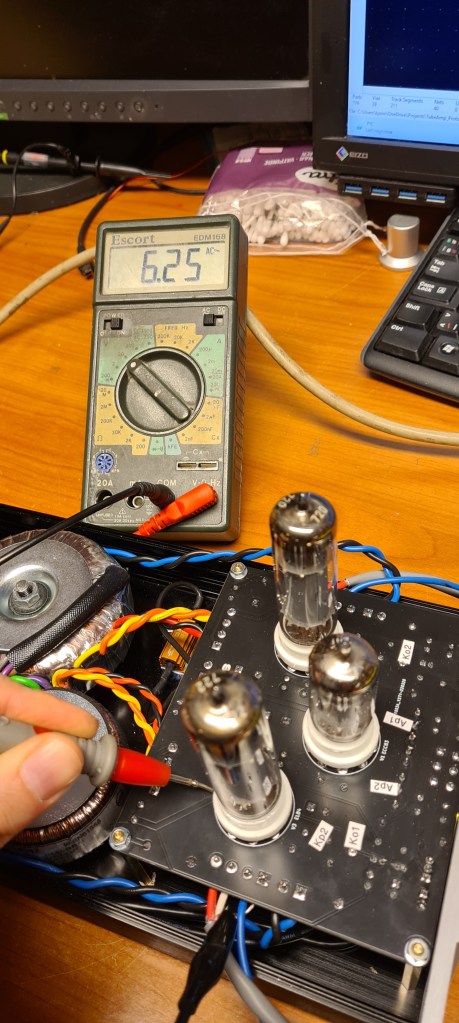 The selected filament heater transformer has a an output of 6Vrms at full load (2.5A), and 7Vrms at at no load. For an estimated load of 1.9A, I was hoping for something close to the tube filaments’ nominal voltage of 6.3V, and it turned out to be almost perfect 🙂