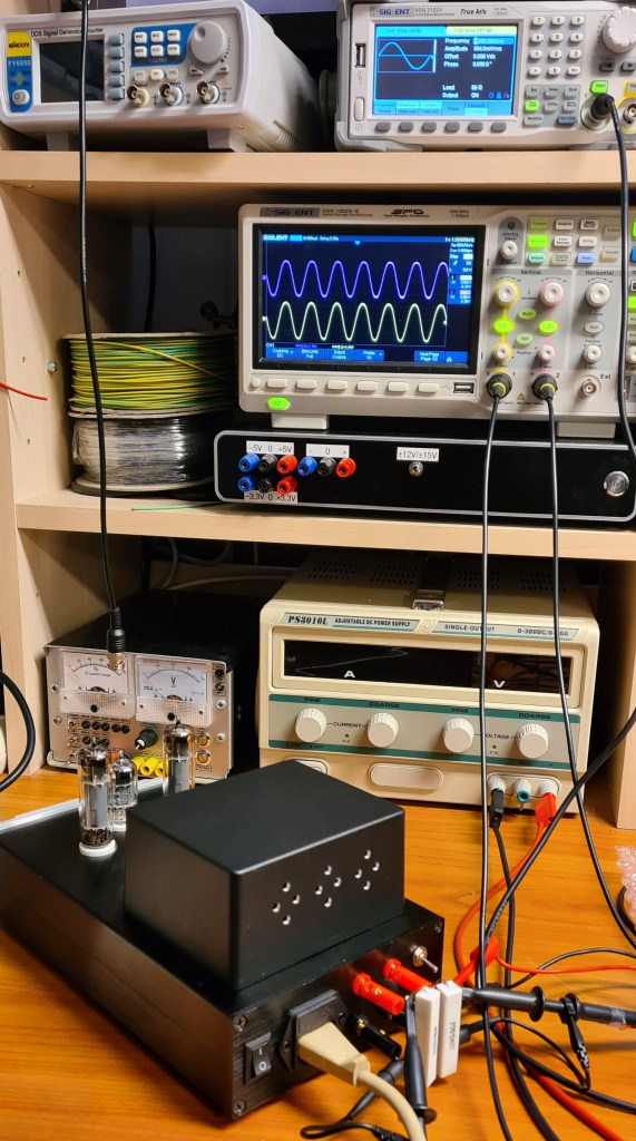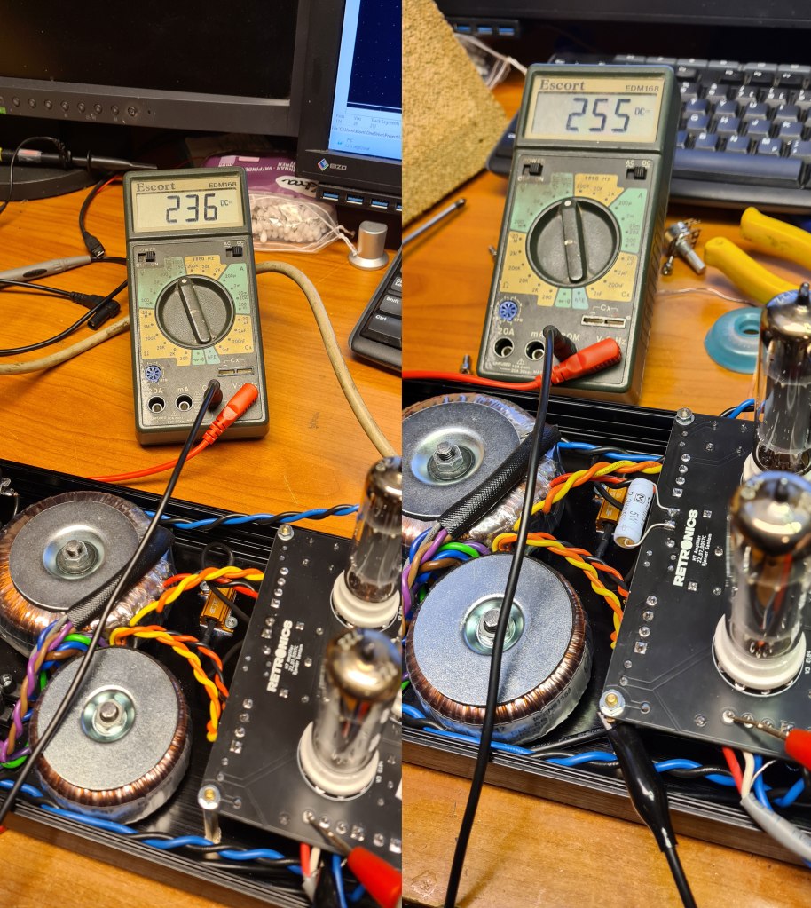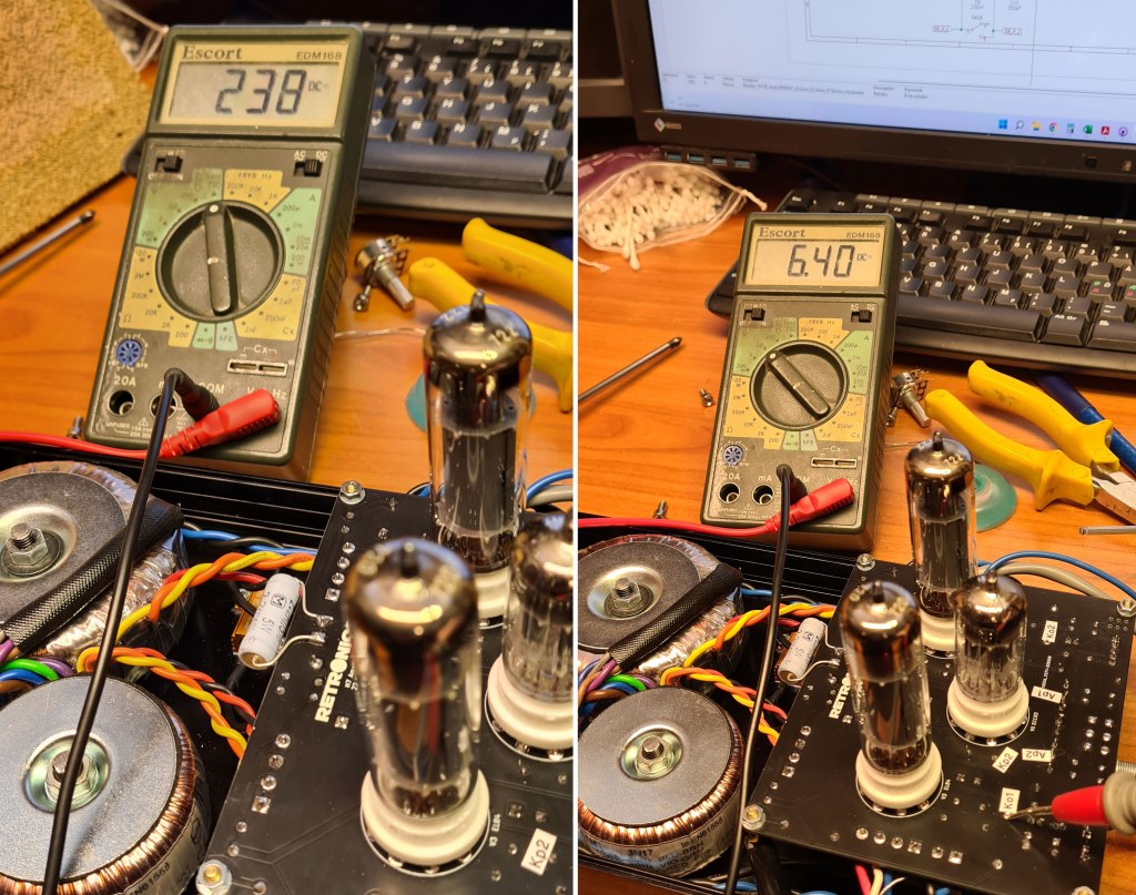 Anode voltage, supplied from the output transformers’ “low side”, is 238VDC. Over the cathode resistors of 160Ω, I measured a voltage of 6.4V. The current running through each tube is 6.4V/160Ω=40mA. Thereby, the tubes’ heat dissipation is 238V*40mA ≈ 9.5W. This means the EL84s are operating safely within their comfort zone (rated max. power = 12W).