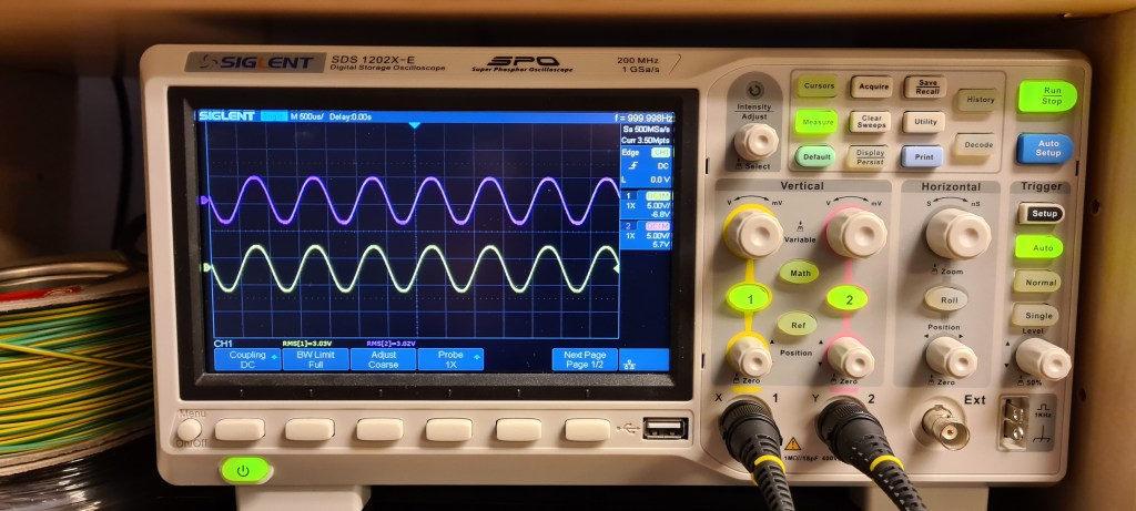As dummy loads, I used a pair of 3.3Ω power resistors. Both audio inputs were fed from a function generator.