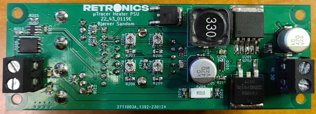 The circuit is powered by its own 19.5V/>3A laptop adapter, to ensure sufficient current capability, and to keep the heater PSU galvanically separate from the µTracer, all the way until an interconnection between the cathode and one heater terminal on the front panel.