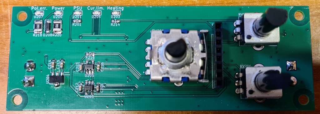 Close to the heater output terminal, MOSFET Q201 turns the output voltage on and off, on signal from a microcontroller on the measurement board (which will be described in next post). Pin socket J202 interconnects the two boards.