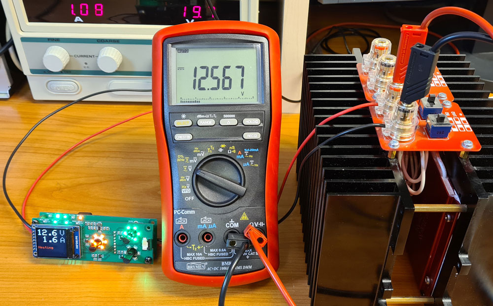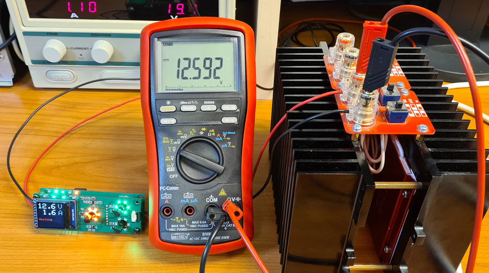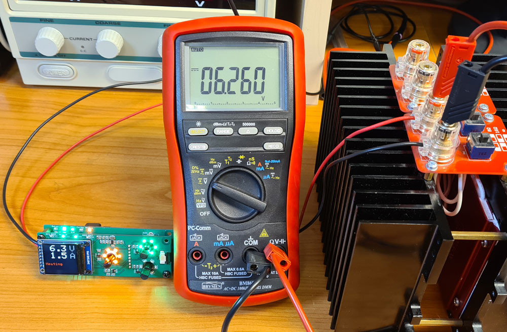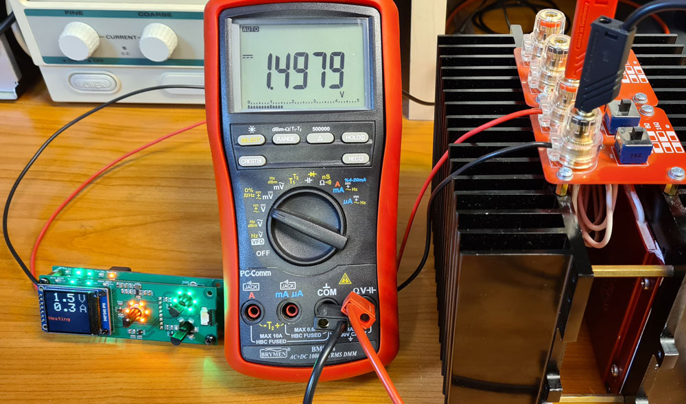 Conclusion: This heater supply provides significant accuracy improvement over the PWM solution, especially at low voltages. There is some voltage decrease as the XL4005 heats up, probably due to temperature coefficient the internal 0.8V voltage reference. This is after all a cheap buck converter, and it would probably possible to improve the temperature stability by using a more advanced buck converter chip.