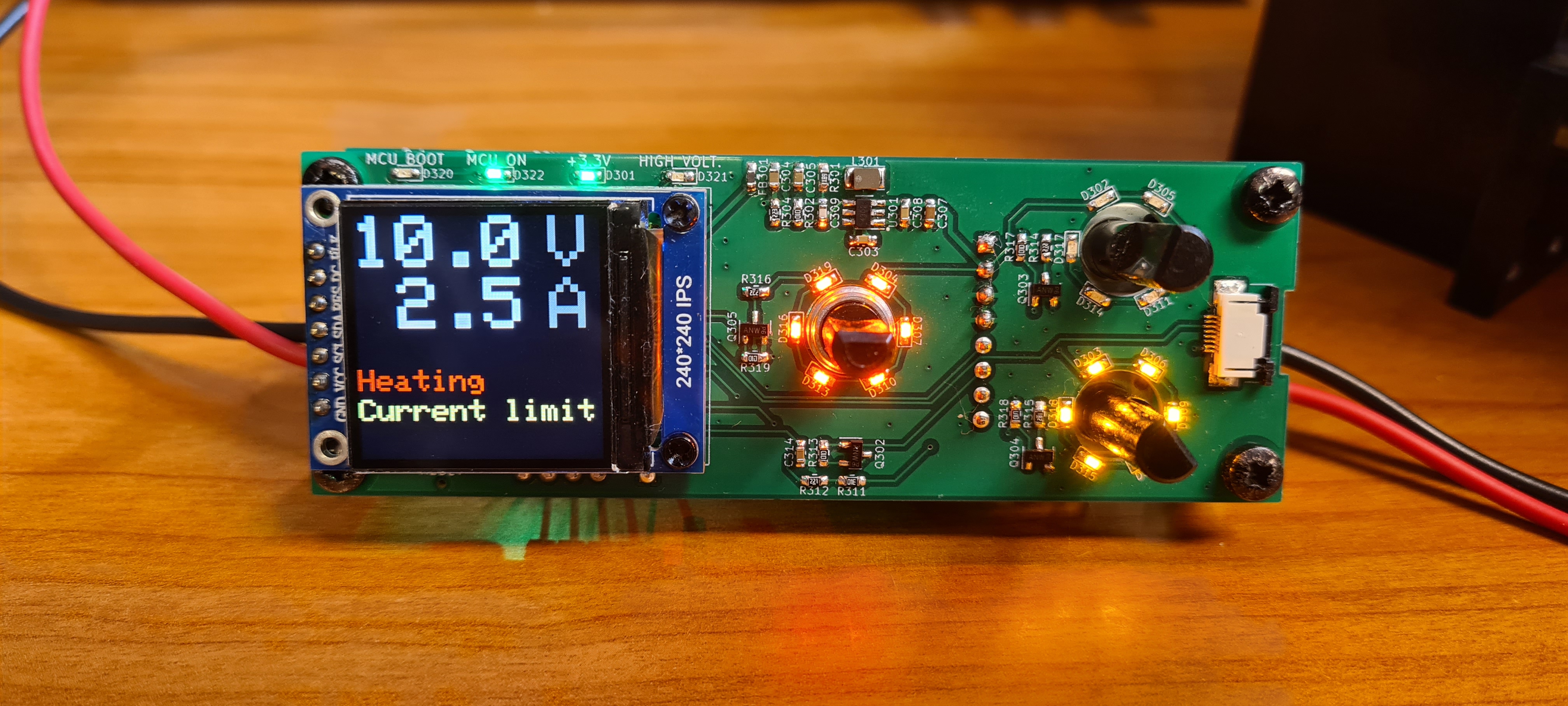 From the pictures above, we can see that green LEDs around the voltage potentiometer are lit when set voltage is the limiting factor (current limiter is inactive). When the current limiter is active, yellow LEDs around the current potentiometer are lit. Orange LEDs around the selector switch are lit when the heater output is turned on.