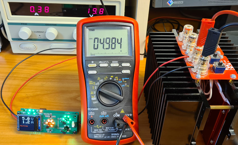Conclusion: This heater supply provides significant accuracy improvement over the PWM solution, especially at low voltages. There is some voltage decrease as the XL4005 heats up, probably due to temperature coefficient the internal 0.8V voltage reference. This is after all a cheap buck converter, and it would probably possible to improve the temperature stability by using a more advanced buck converter chip.