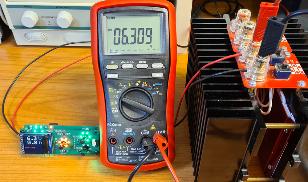 As when testing the µTracer’s internal PWM heater supply, a dummy load with 4, 8 and 16Ω resistance is used. Voltage and current measurements are performed by a multimeter.