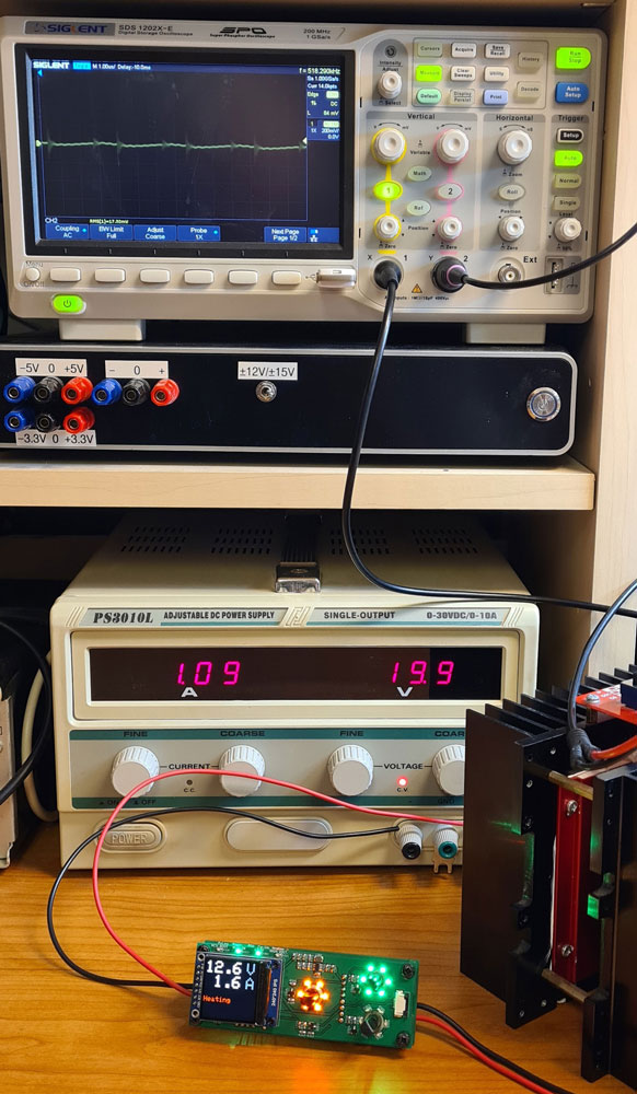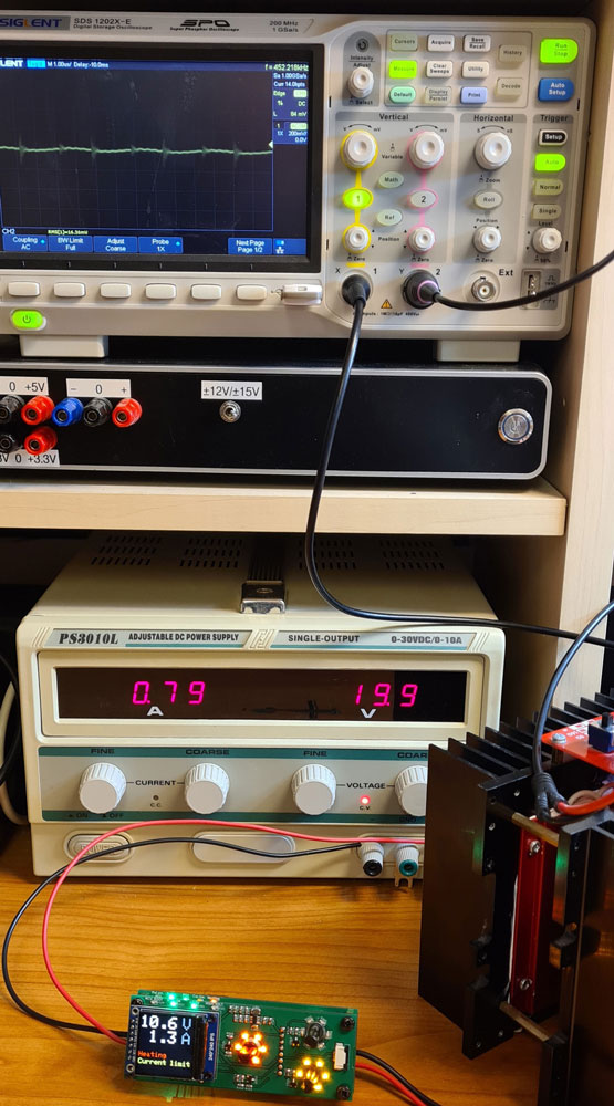 When designing current limiter for the heater PSU, I calculated resistor values to give a max selectable current limit of 2.5A. One concern was whether the current limiter would be stable, i.e. not start to oscillate. It’s time to find out whether it works as planned.