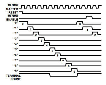 The pulses from MC74HC4060 are fed to the clock input of a CD74HC4017 decade counter, which has 10 outputs with the following sequence: