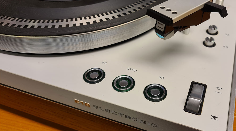 Got myself a 1970s Philips 212 turntable with electronic speed control and individual speed adjustment for 33 and 45 rpm records. This also has strobe markings on the platter mat.