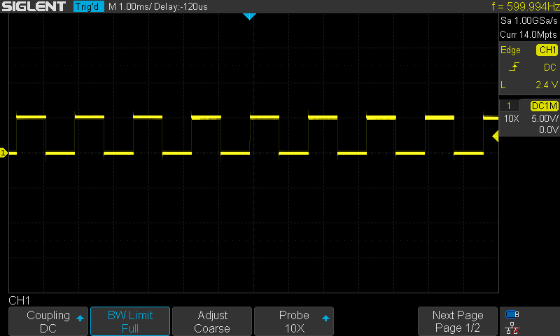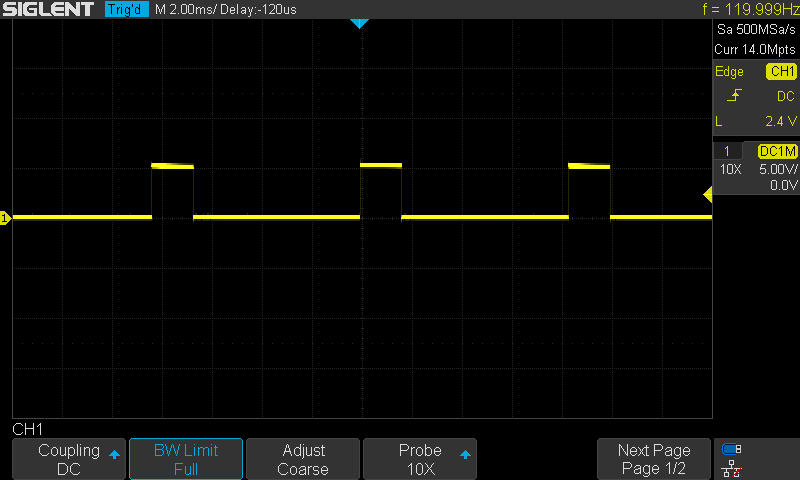 By feeding back the signal from output “5” or “6” to the Reset pin, this IC can count to either 5 or 6 before it resets and starts the sequence from “0”. This way, the 600 Hz clock pulses from the 4060 are divided down to 120 or 100 Hz, selectable by a slide switch. As we can see, the duty cycle is reduced correspondingly, but this isn’t necessarily a bad thing when it comes to driving a turntable strobe.