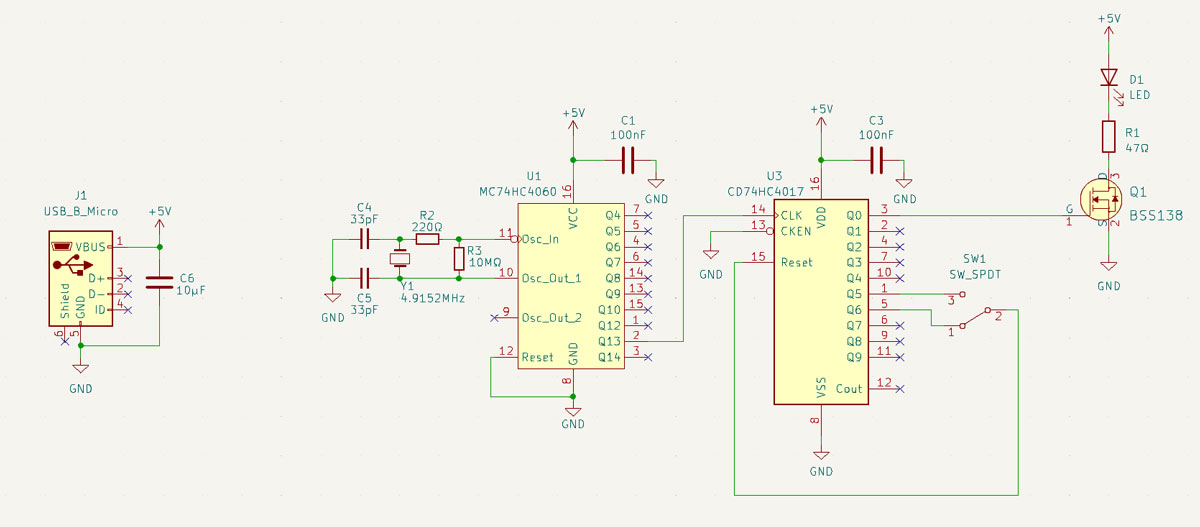 For stability, a crystal controlled oscillator is needed, and for supporting both 50 and 60 Hz strobe discs, the circuit must be able to flash a LED at either 100 or 120 Hz, selectable by a switch. To avoid need for batteries, USB was selected as power source. The circuit I came up with is this: