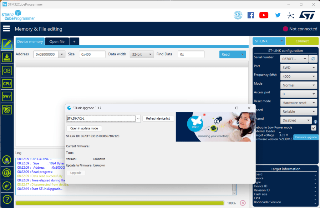 When programming STM32 devices, ST-LINK is my preferred interface for firmware upload and testing.