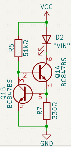 3 LEDs show whether 3.3V, USB voltage (5V), and VIN (5-30V). The circuit to the left is a constant current regulator which makes the LED shine at a constant brightness over the whole input voltage range.