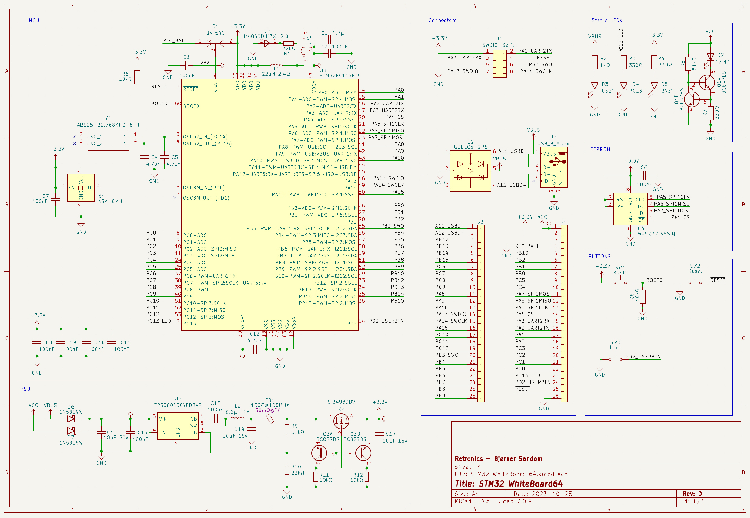 Some commercially available development boards have names like Blue Pill and Black Pill. Since what I designed is a board and it’s white, i decided to call it WhiteBoard64, where the number 64 reflects the number of pins of the MCU. Though being designed specifically for STM32F411RET6, this board is probably compatible with other STM32s (check datasheets for pinout).