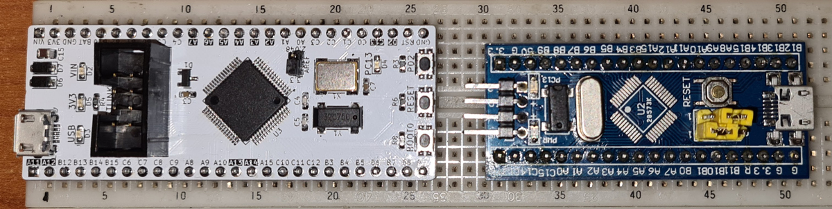 Functionality of the RESET button is pretty obvious, while the BOOT0 pin is used for firmware upload via USB: hold down BOOT0 while hitting RESET. This starts the MCU in DFU mode.