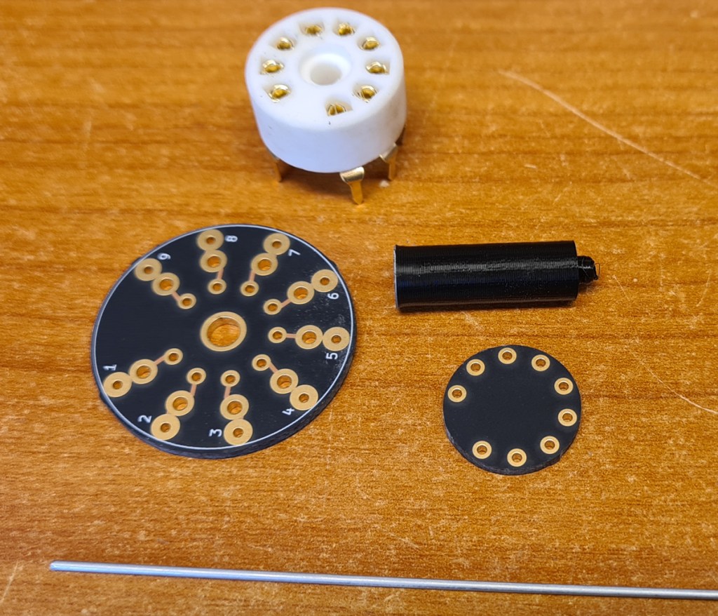 Instead of spending a lot of money on old test sockets, I decided to make my own noval test sockets, and I might as well share design docs and description with you. The solution is based on two small PCBs, to which tube sockets (https://www.ebay.com/itm/191076931572), wire and test rings are soldered. To assemble the two boards at a certain distance, I used some 3D printed plastic parts. PCB design files (Kicad), production files (Gerber) and 3D models (.stl) are shared on Github.