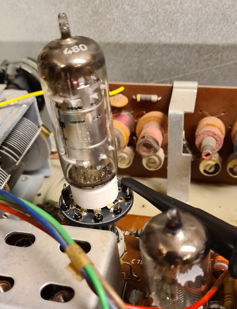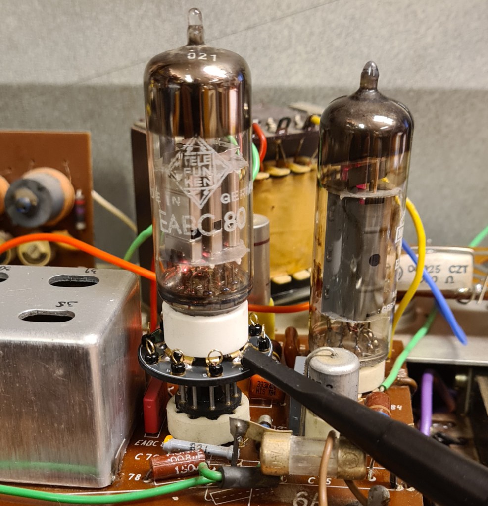 Adding test sockets between the tube sockets and the tubes will ease the access for measurement and signal injection. Test sockets may still be found for sale, e.g. on online market places, but they tend to be quite expensive. Here are a couple of examples from eBay (1 NOK ≈ 0.1 USD):