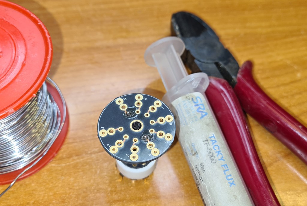 Repeat until all wires are connected, then remove the assembly from the tube socket. Clean off remaining flux with some alcohol.