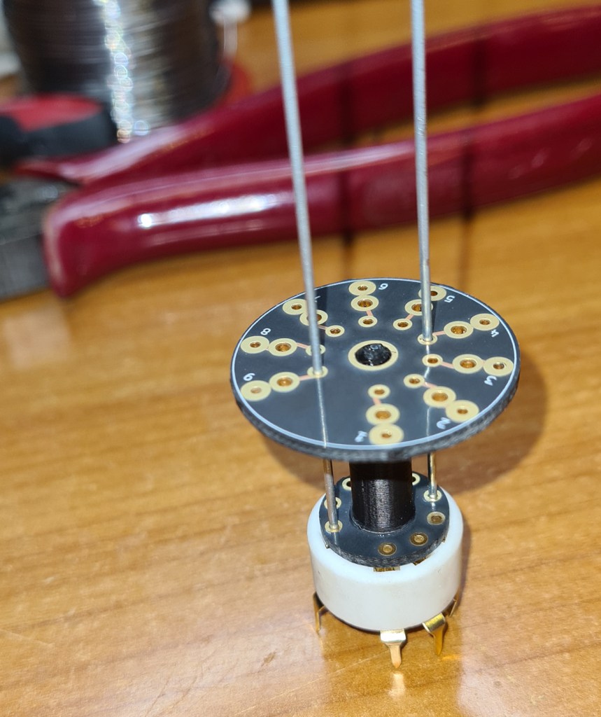 To get the wire lengths right, thread a couple of wires through the top (largest) board board, then through the bottom (smallest) board, and all the way to the bottom of the tube socket, as in the picture.