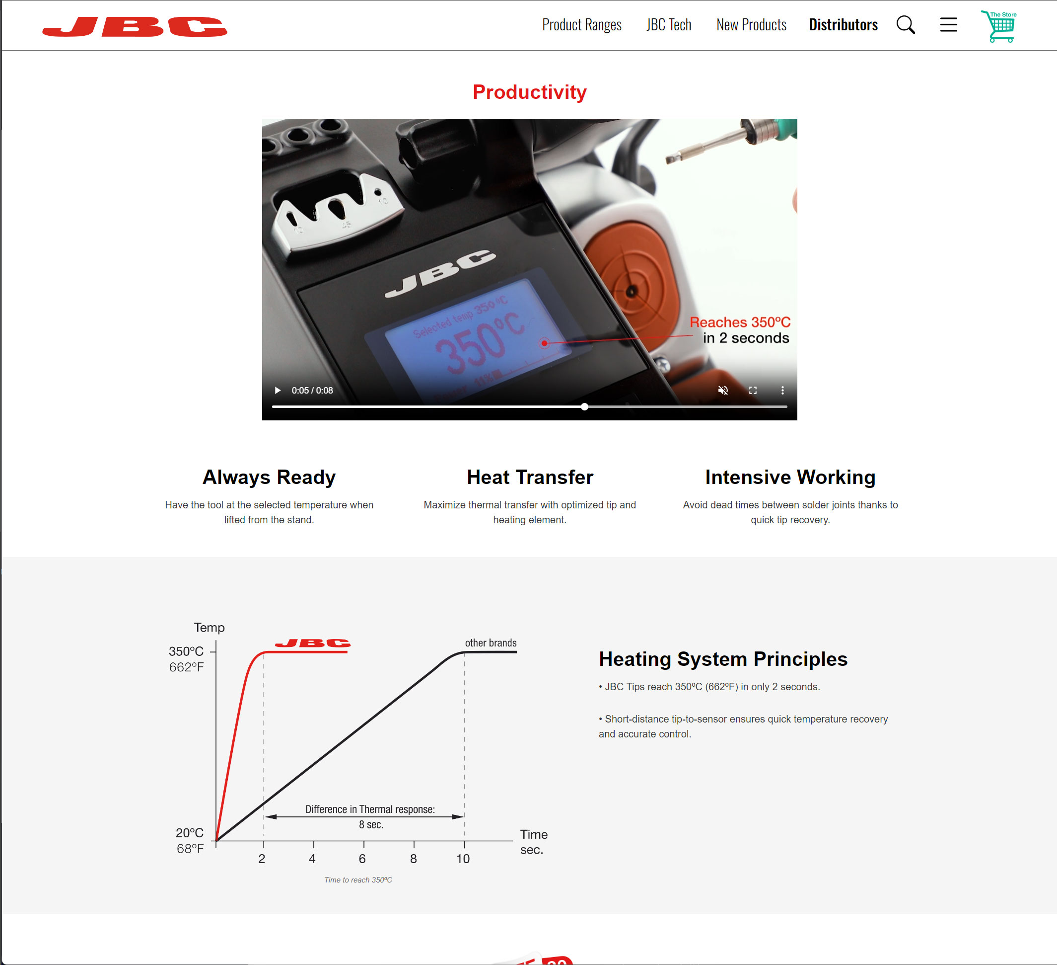 You say that the heating time is 2 seconds, but only for the C210 cartridge range. The CDB station, however, is sold with the T245 handle, which is for C245 cartridges (product page screenshot: 07.jpg). How can you then assert that the heating time from 20 to 350°C for this product is 2 seconds? The product page is linked to a page showing a perfect heating curve, with no overshoot, and 2 secs heating time (08.jpg). This page also contains the statement “JBC Tips reach 350°C (662°F) in only 2 seconds”, but nowhere does it mention that this applies only to specific cartridges from one of the cartridge ranges. This is deceptive marketing. Equivalent info is found on the Eleshop web shop (09.jpg).