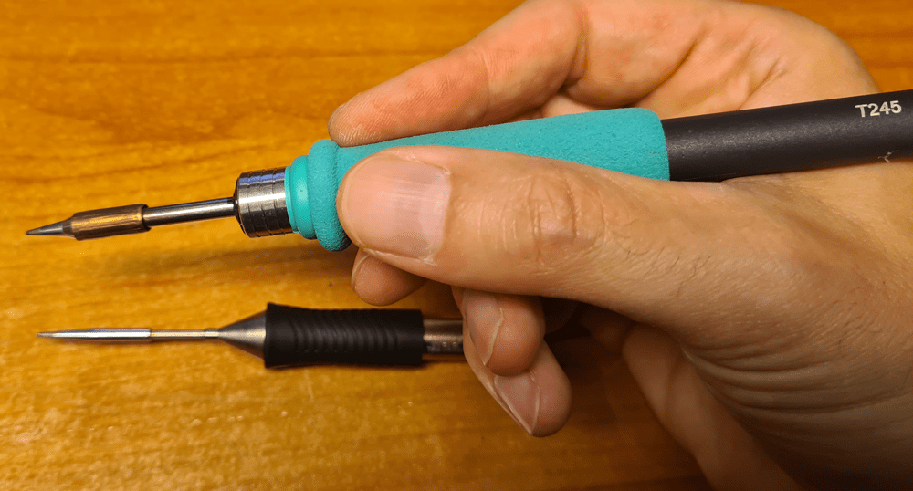 The handpiece is important. At first, the JBC T245 feels more ergonomic than my temporary DIY handpiece, which is basically an aluminium tube with some electronics inside.