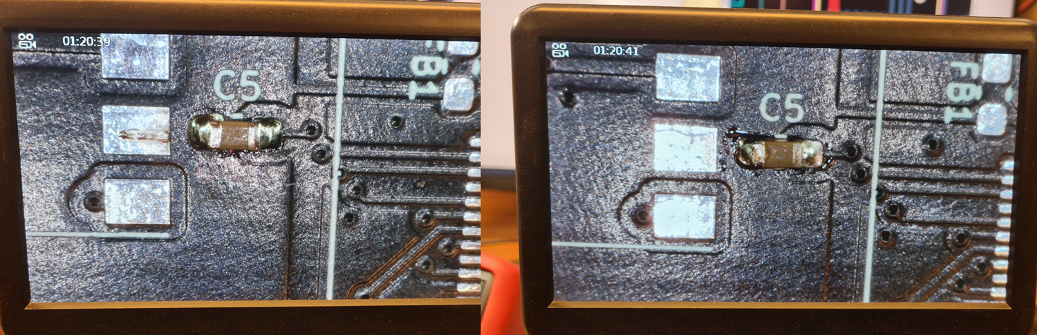 This was a struggle for both of them, but when given some extra time to heat up the copper area, and some additional flux, they both managed to do it. Looking at the solderings under a microscope, the DIY station has provided a better result than the JBC, which is also surprising, given that JBC has a much higher power rating, and that they’ve got a team of engineers which probably has spent a lot of time trying to optimize the algorithms for power and temperature control, while I haven’t even started to write algorithms to counteract heat drop in my DIY solution. The picture below shows the results of DIY tool to the left, JBC to the right.