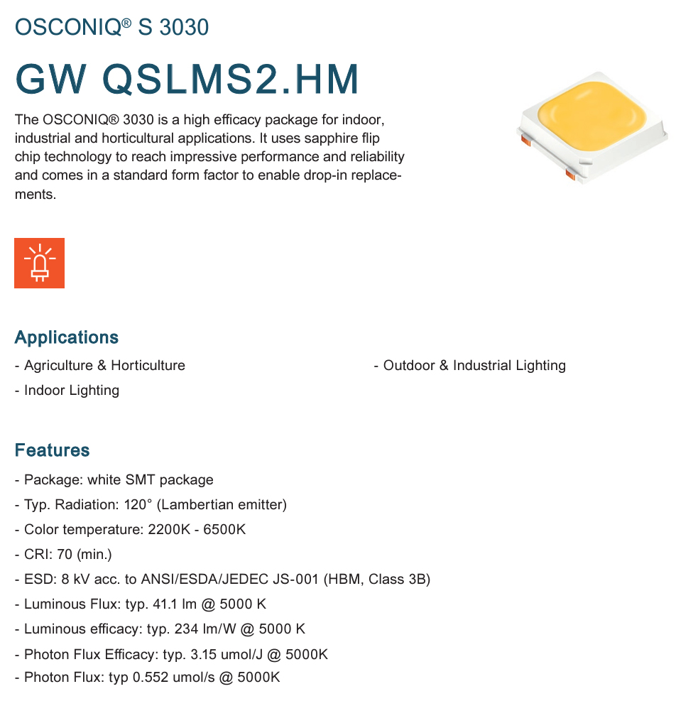 The chosen LEDs are the Osram GW QSLMS2.HM, which have a high efficacy, and which comes in a range of several different color temperatures. I went with 5700K, a cold white mix of wavelengths resembling daylight.