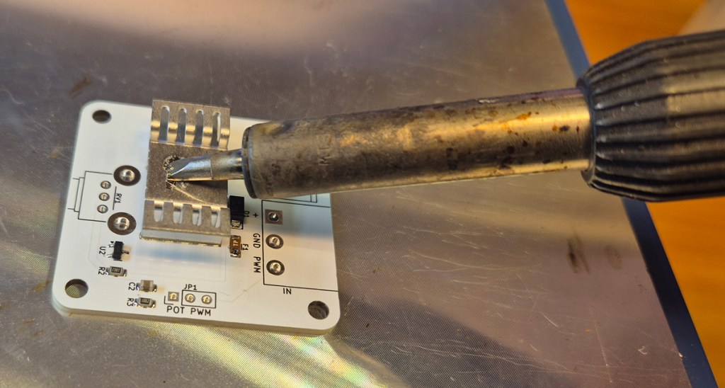 The hot plate set at 200°C wasn’t sufficient to melt the solder paste under the heatsink, so I helped it out with a soldering iron.