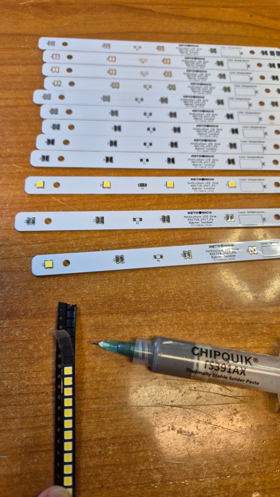 The LED strips can be assembled with solder paste and a hot plate like this, or in a reflow oven.