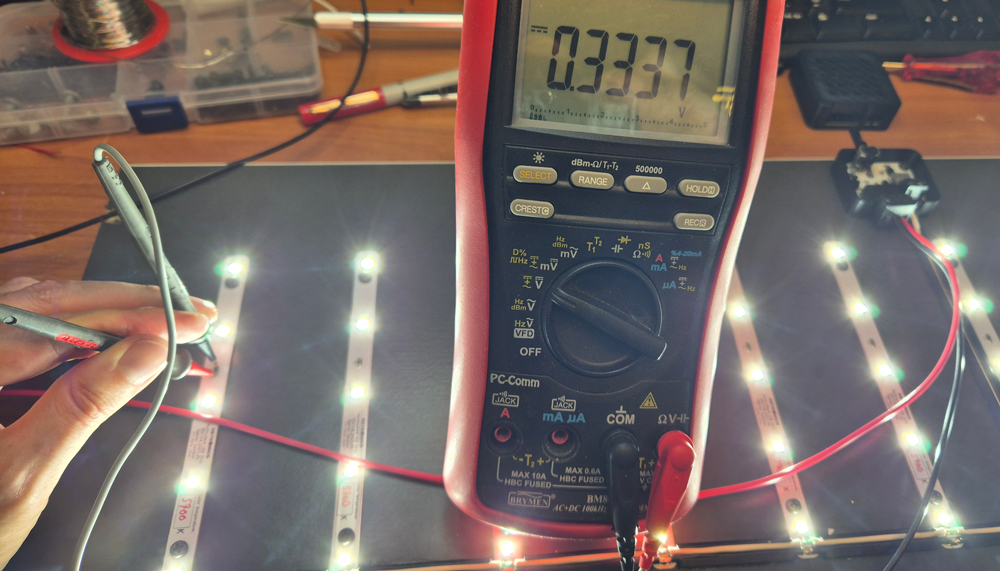 When driving a single shelf plate with 60 LEDs at a total of 1.8 A (dimmer set to max), the current draw from the power adapter is a little less than 1.5 A, so in theory each such PSU can deliver enough power for 8 shelf plates à 60 LEDs. For this project, I’m using up to 6 shelf plates per PSU, keeping the power adapters well within their comfort zone.