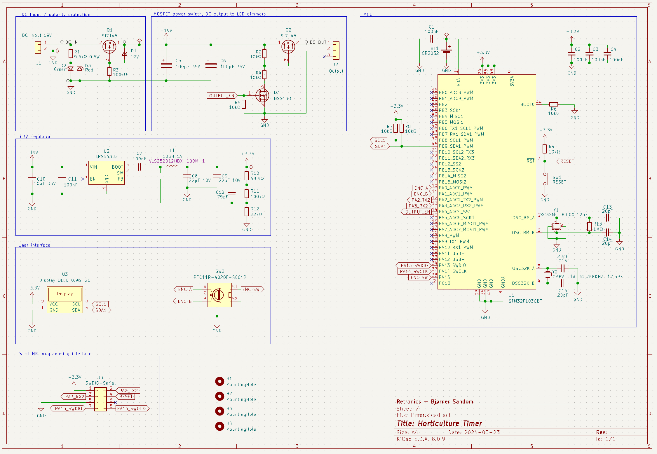 On the DC input from the aforementioned laptop PSUs, there is a polarity protection circuit. If you should happen to reverse the polarity from the PSU, a red LED will shine, and the rest of the circuit is unaffected. An STM32F103CBT microcontroller with integrated real-time clock keeps track of time, which is presented in an OLED display. Actual time and LED on/off time is adjustable with a rotary encoder. Settings are stored in non-volatile memory of the STM32, and a battery keeps the real-time clock alive during power outages.